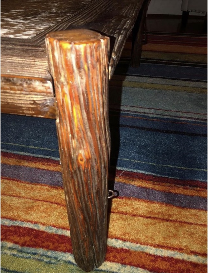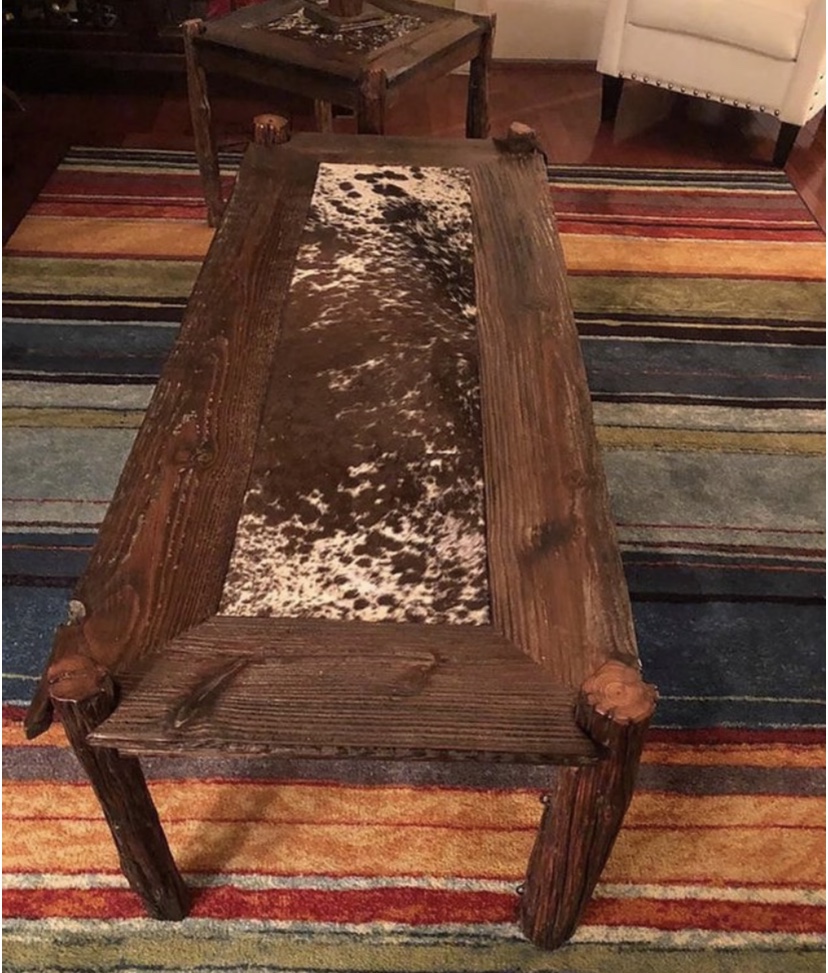 Custom made unique style living room set cocktail and end table with lamp! This set includes a cocktail table table, end table and cow hide fence post lamp. All are made from very old cattle fence posts (circa 1930’s), cow hide is authentic and very old barn boards . The Lamp has a saddle branding Coffee Table is $450, End Table $325 and Cowhide Table Lamp Fence Post is $265. The entire set sold together is $995