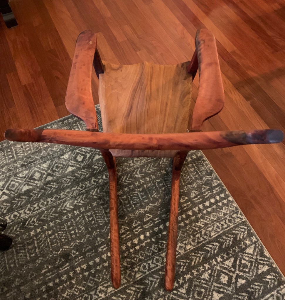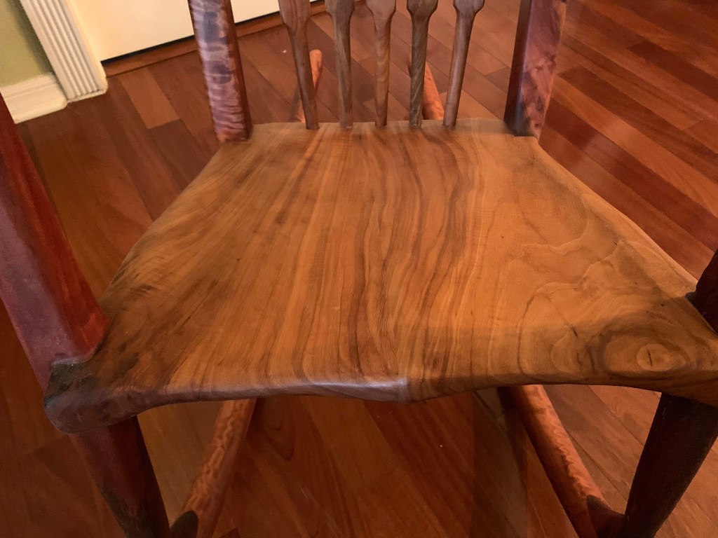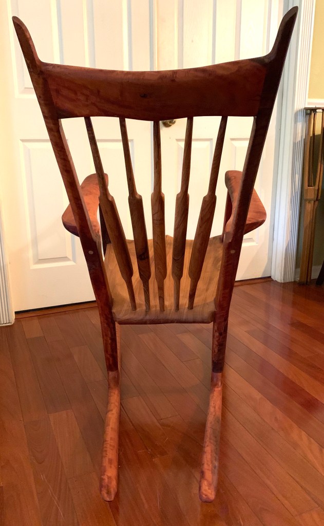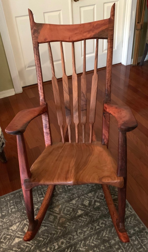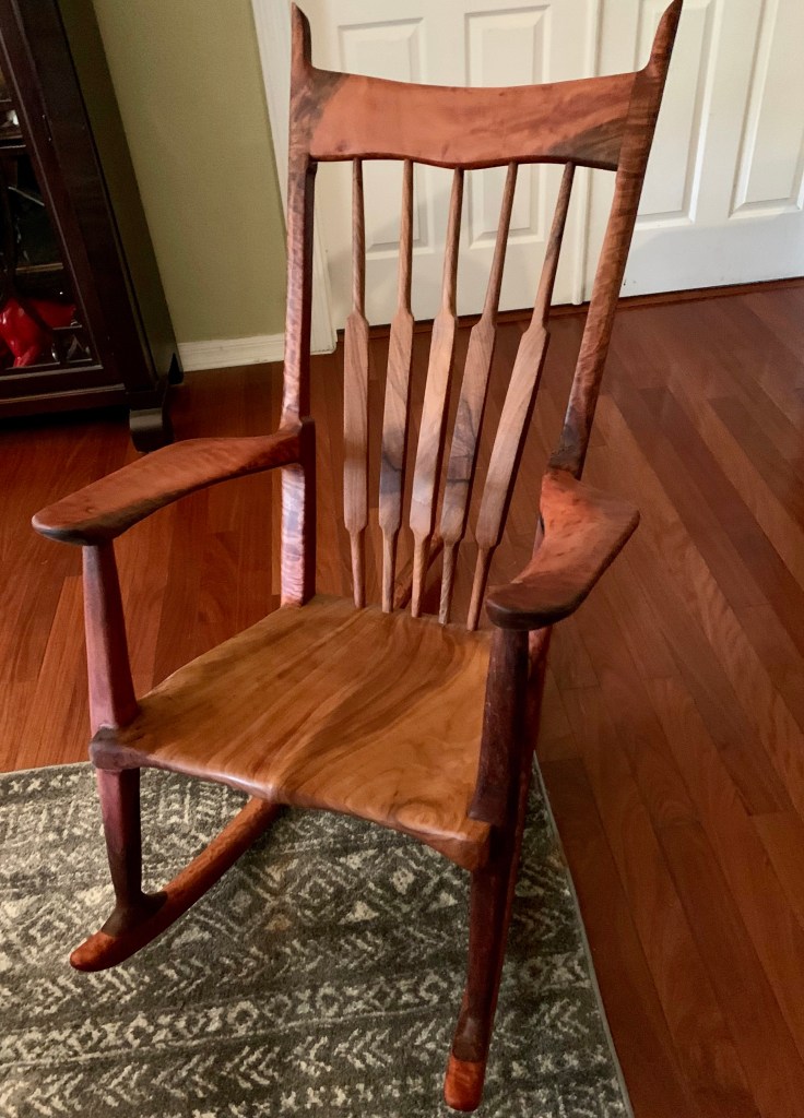 This rocking made from Swamp Mahogany . What an amazing piece of artwork “Sam Maloof” style. The seat is made from pecan wood as are the spindles. The rocker laminated with swamp Mahogany. This pice of art took many man hours to complete. By far the most challenging wood work art piece ever made. The seat was sandpapered fine for weeks. If interested , please go to http://www.southerncarpenter.com