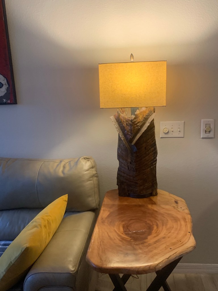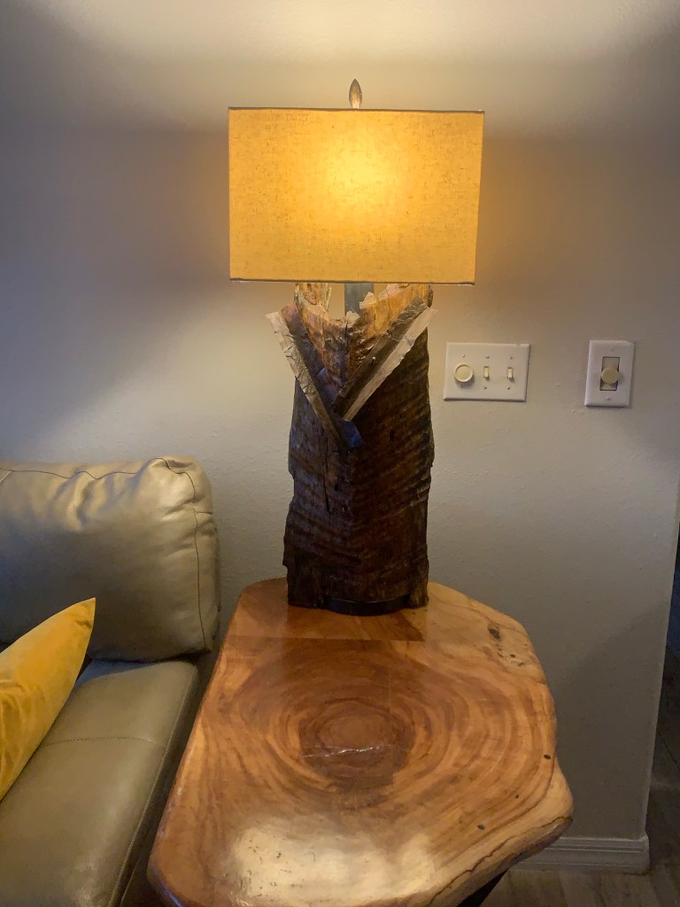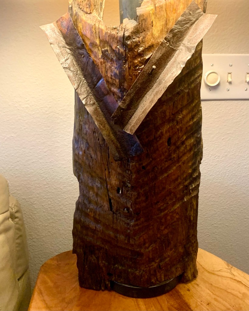 Turn of the Century method to extract turpentine from pine trees in Central Florida. This tree was completely dead when found. I noticed metal pieces that was used to guide the turpentine into a bucket (not displayed). When the turpentine would stop producing the metal pieces would be shifted to a new scratch location man made via tool. Note all off the scratch marks over the years as this old tree produced turpentine. The reason they call this tree “Cat Face” is because it looks like the whiskers of a cat. I decided it would make a great piece of history art and turned into a Lamp.