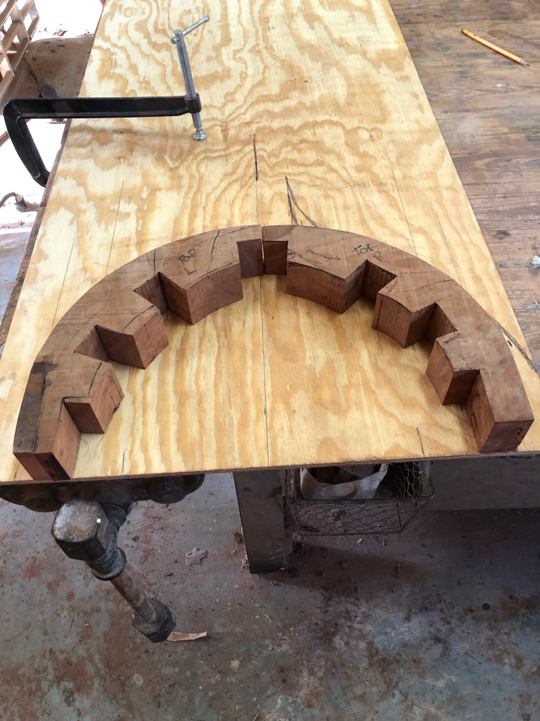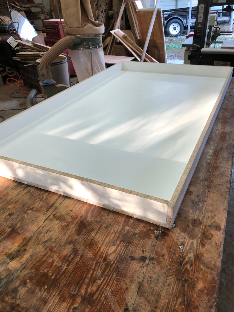 I had to build a jig and cut 1/4” slices to form a semi-circle. After gluing 10 pieces together and obtaining my desired hand sculpted shape. Not an easy feat to get curved table base as you will see in the pictures. After the base of table was completed , this being my first project having to build a mold from Melamine , the size 1/2 inch larger than planned for the top table size of 63”long by 36” wide.