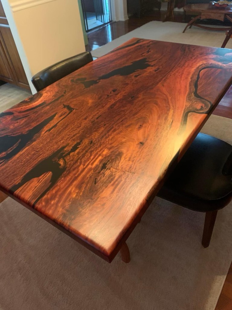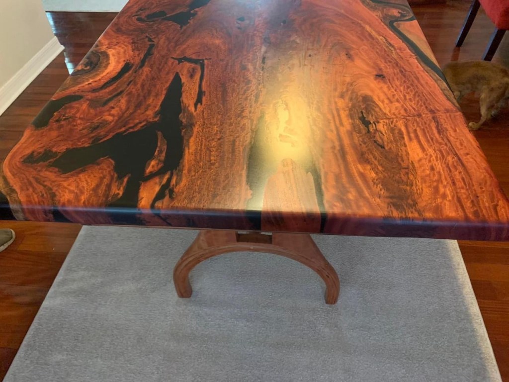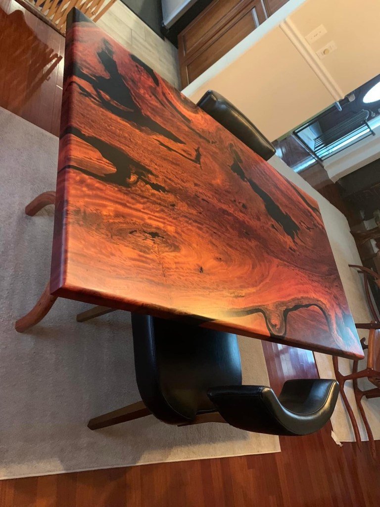 I built this dining room table for my wife. We’ve sold the previous dining room tables I’ve made over the years. Getting a new slab of wood costing $800, I knew then that I was going to build her a dining room table with all her favorite colors. By the time I finished this beauty , my wife was extremely happy. It is clearly aone of a kind piece!