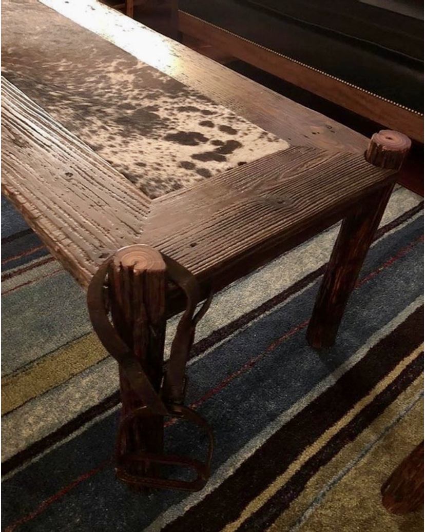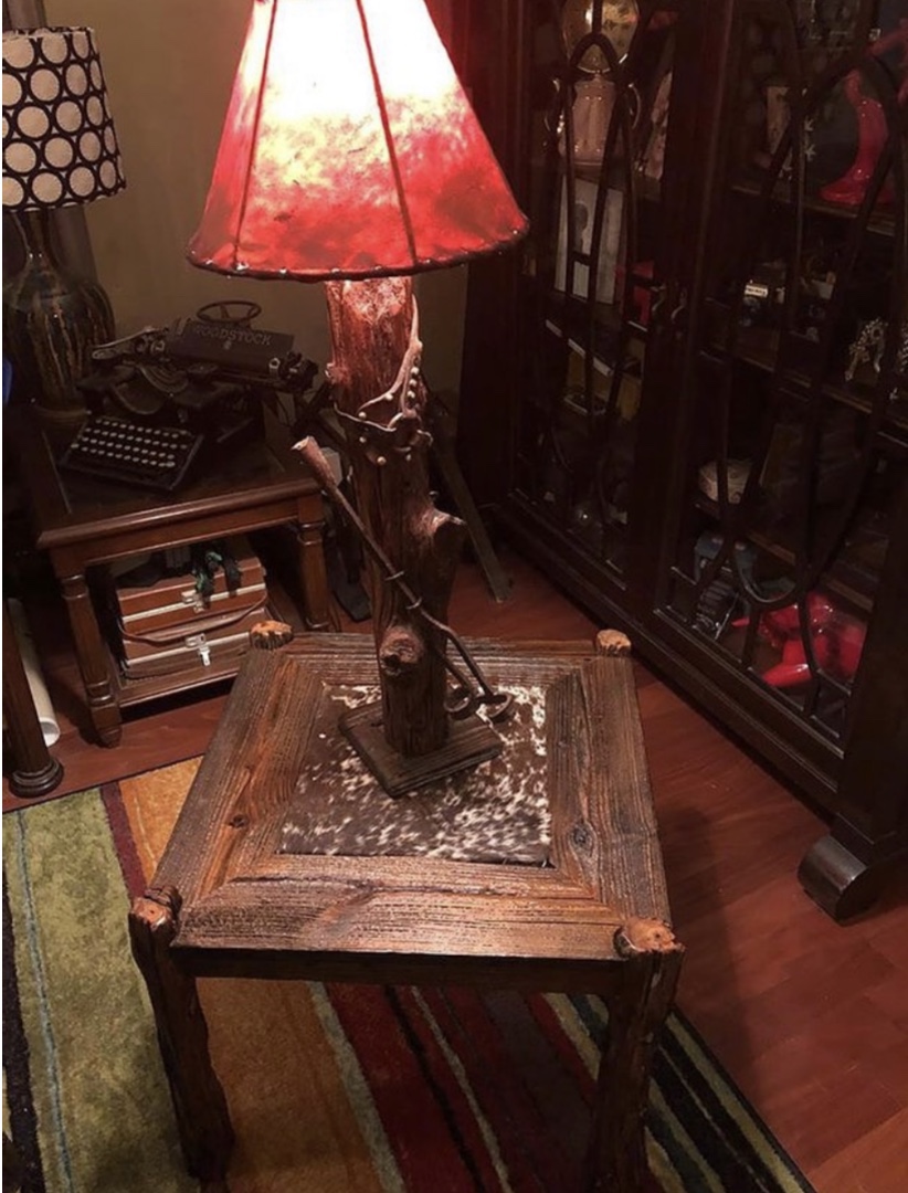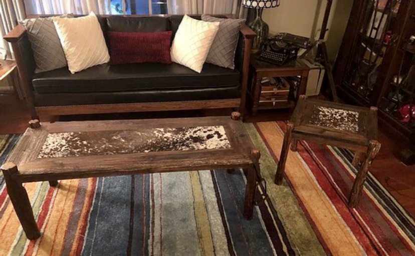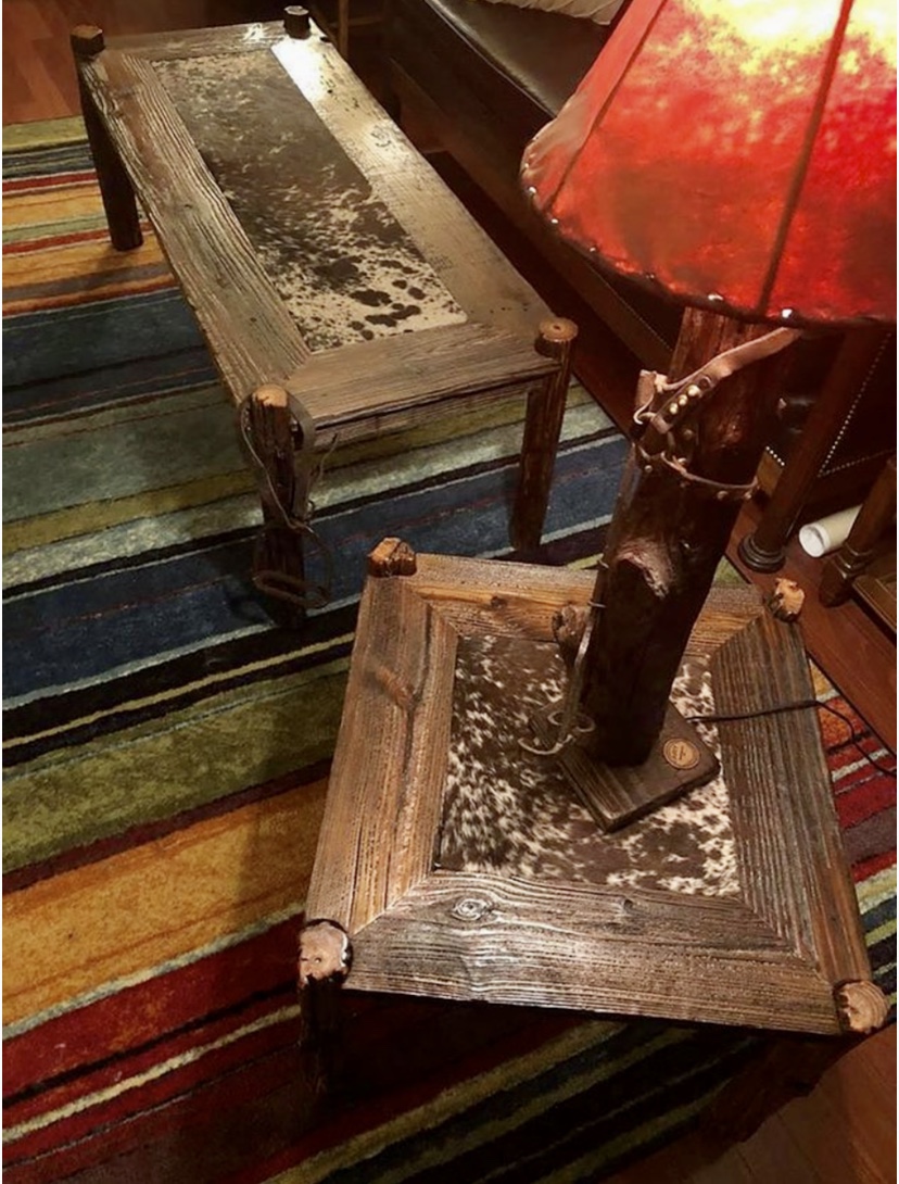 Custom made unique style living room set cocktail and end table with lamp! This set includes a cocktail table table, end table and cow hide fence post lamp. All are made from very old cattle fence posts (circa 1930’s), cow hide is authentic and very old barn boards . The Lamp has a saddle branding Coffee Table is $450, End Table $325 and Cowhide Table Lamp Fence Post is $265. The entire set sold together is $995